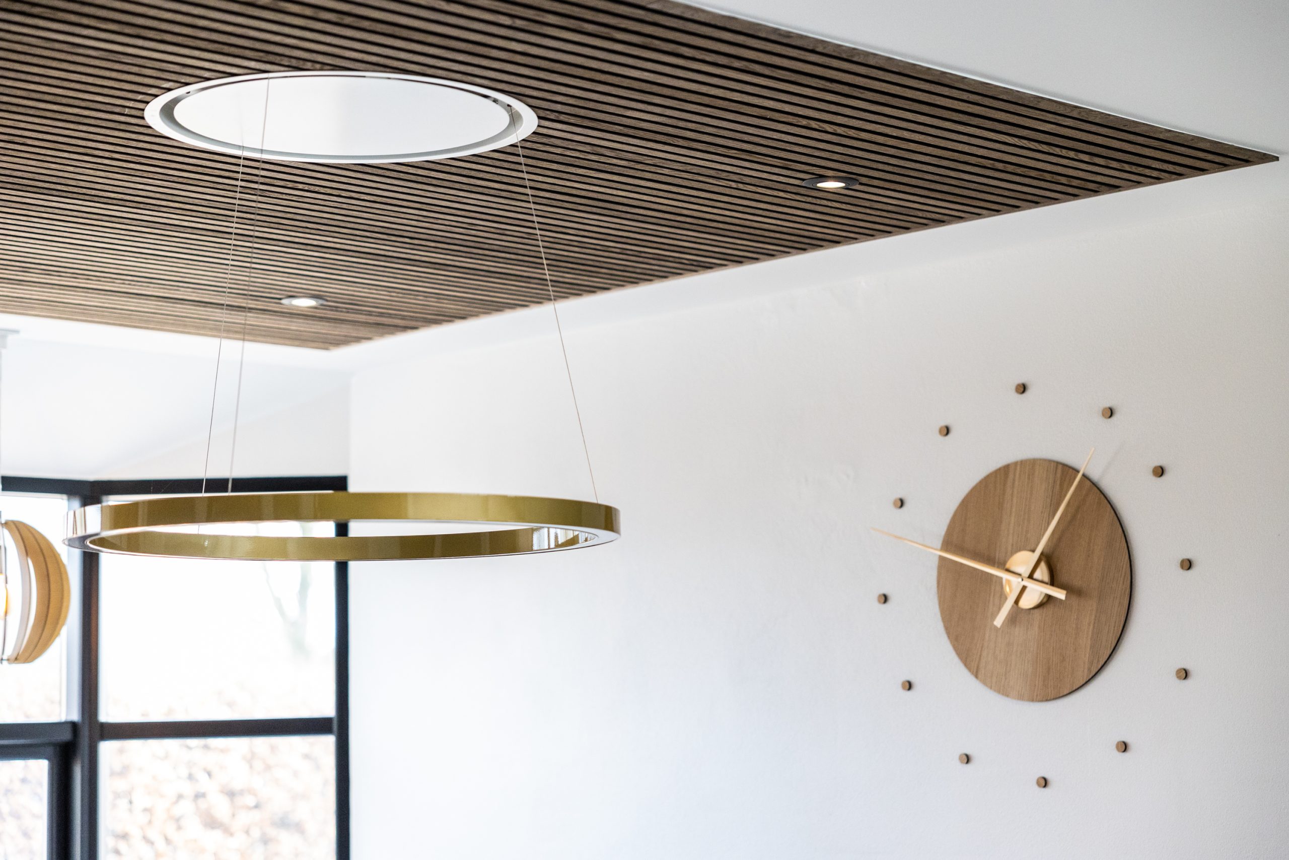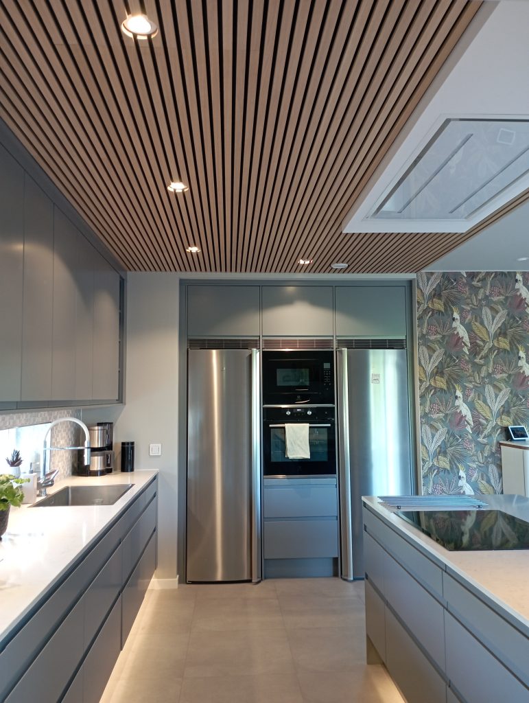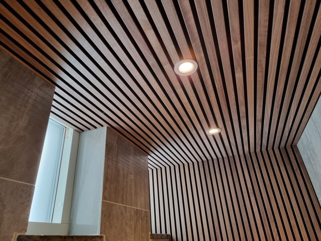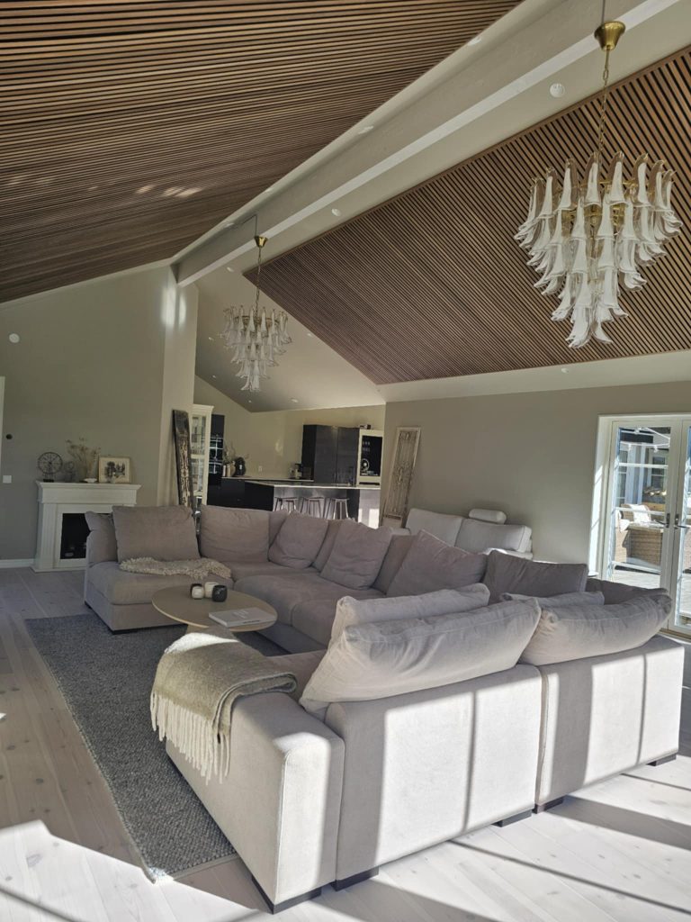 Vill du ha en mer markerad och exklusiv övergång mellan panelerna kan du använda avslutningslister även här. Listen placeras mellan panelerna och skapar en tydlig linje som ger struktur och symmetri i taket. Det är ett perfekt val i större rum där du vill ha ett extra genomtänkt och designat resultat.