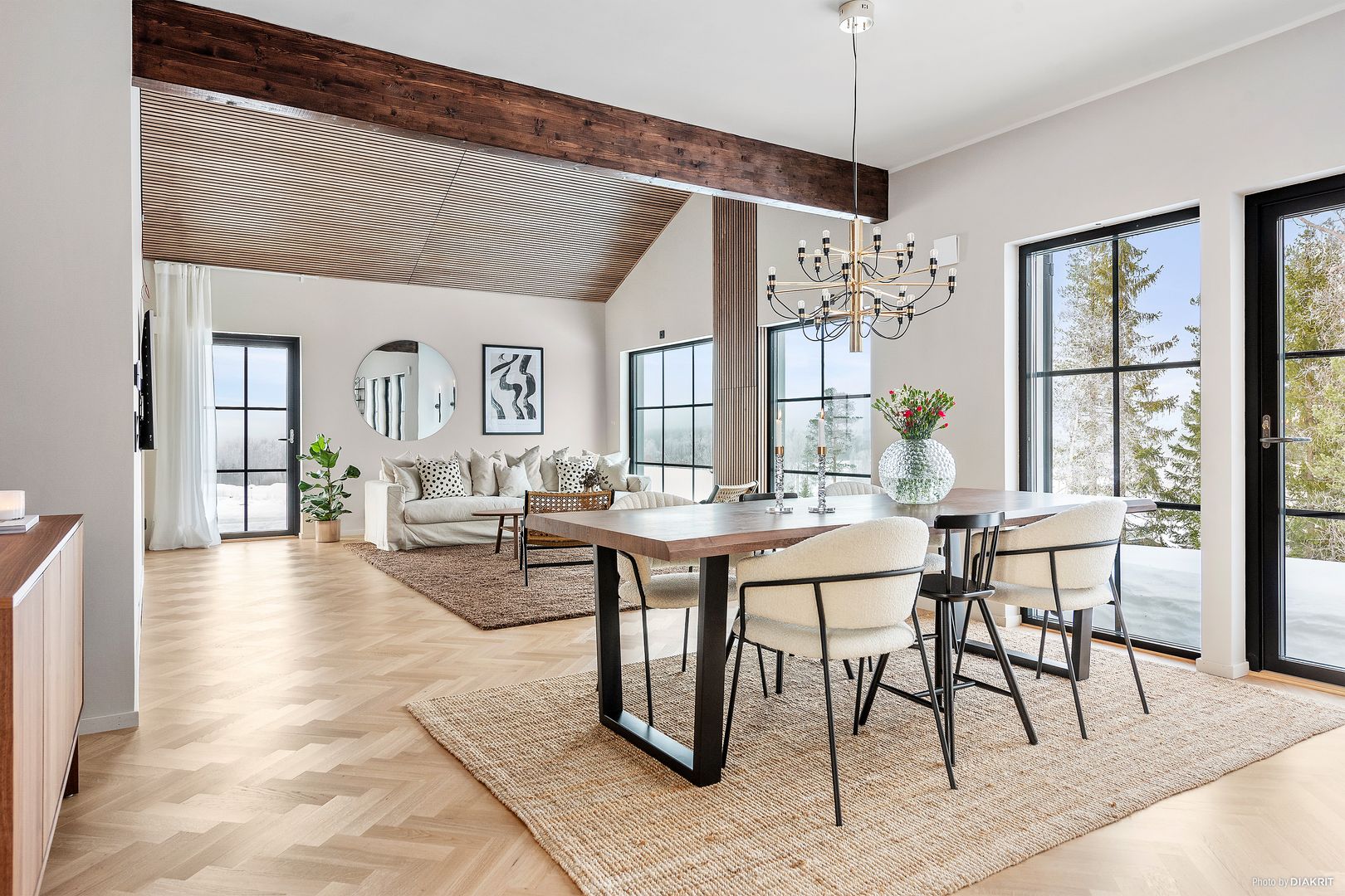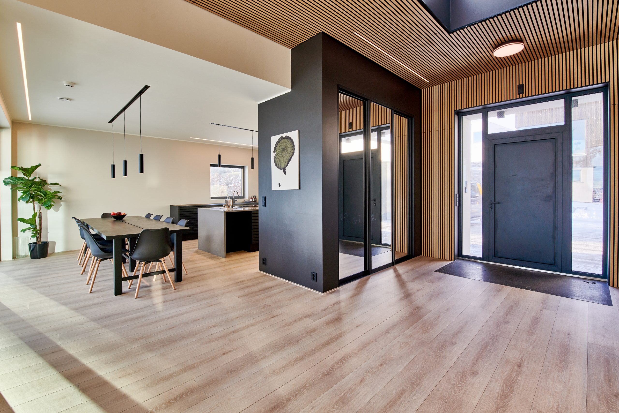 Vill du ha ett tydligt och elegant avslut kan du rama in akustikpanelerna med avslutningslister runt om. Det ger ett mycket rent och genomarbetat intryck där panelerna upplevs som en egen yta i taket. Den här lösningen är populär över matplatser, i vardagsrum eller i öppna planlösningar där du vill markera en zon.