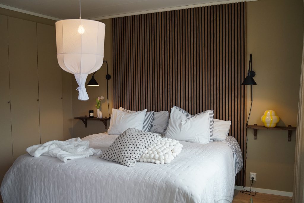 Akustikpanelen återkommer på fler platser i huset – under en hylla i den lilla passagen mellan kök och vardagsrum, på en vägg i trapphuset samt i form av en sänggavel som sträcker sig upp till taket i Lovisas och Lukes sovrum.