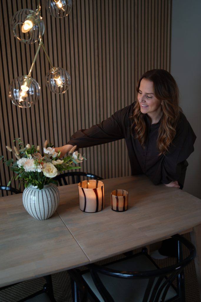 Ovanför bordet hänger en elegant lampa bestående av en mässingsarm med klara glaskupoler som lampor. På bordet står ljushållare i milda orange toner.