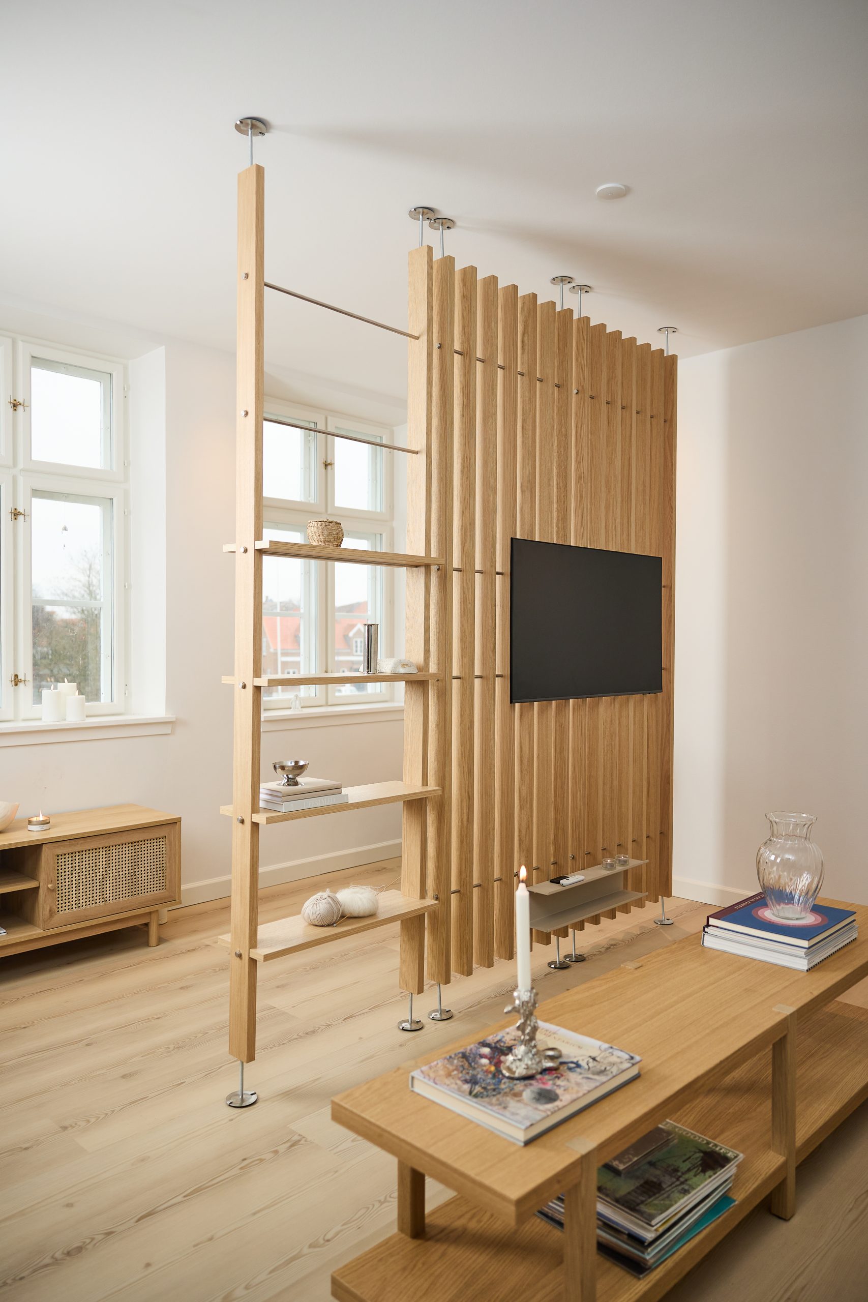 Ekbordet i ek tillför värme och hjälper till att skapa en lugnare känsla i rummet. Naturligt trä mjukar upp utseendet på rumsavdelaren och ger en balanserad, skandinavisk känsla.