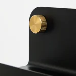 WoodUpp: närbild på en svart matt metallhållare med rundade hörn och subtil lek med ljus. En cylindrisk, räfflad mässingsknopp med varm guldfinish skruvas fast i fronten. Bilden visar WoodUpps minimalistiska väggkrok/handtagsdetalj med tydlig textur och kontrasterande material, med slät matt yta och elegant industrikänsla.