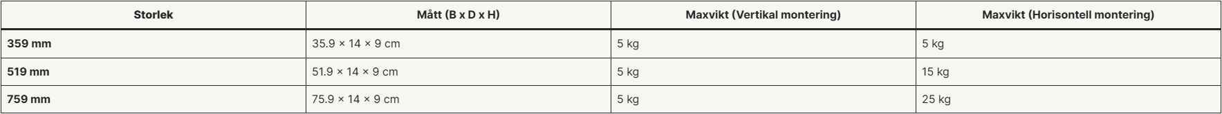 | Storlek | Mått (B x D x H) | Maxvikt (Vertikal montering) | Maxvikt (Horisontell montering) |